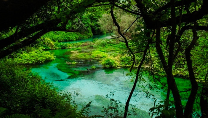 Un profundo manantial natural con un centro de color azul eléctrico y agua cristalina, que ofrece uno de los lugares más sorprendentes de Albania para hacer fotos de la naturaleza.